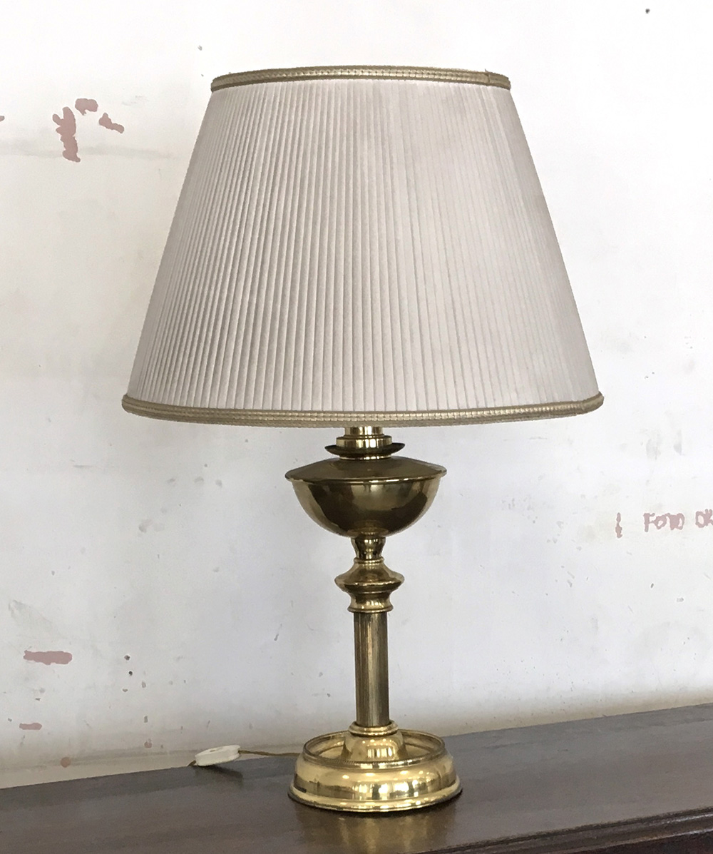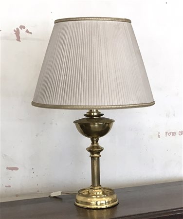 Lampada da tavolo in ottone con fusto tornito e scanalato, paralume in stoffa (h cm 74)(difetti)