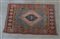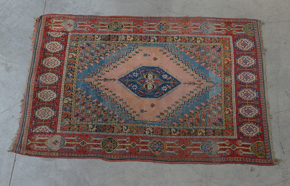 Disegno a piccoli medaglioni lanceolato blu su fondo rosa angolari azzurri, bordura principale con motivi a ottagoni su fondo rosso (cm 183x121) (difetti)