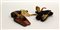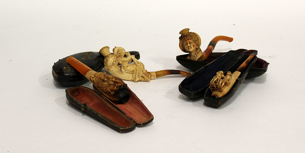 Lotto composto da quattro pipe in schiuma scolpite a figure, bocchini in ambra. Secolo XIX, in custodie (difetti e mancanze)