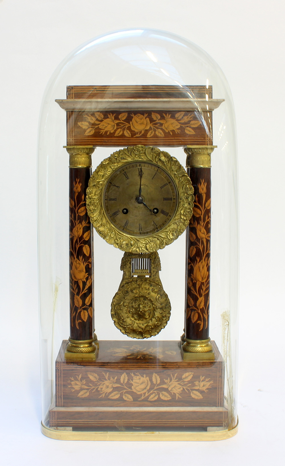 ANONIMOOrologio da appoggio a portico in legno intarsiato e metalloMetà...