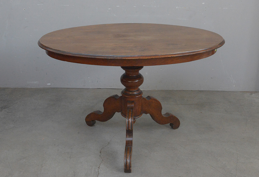 Tavolo in noce con piano ovale, gamba centrale tornita con tre piedi a sagoma. Sec. XIX (cm 120x77x82)