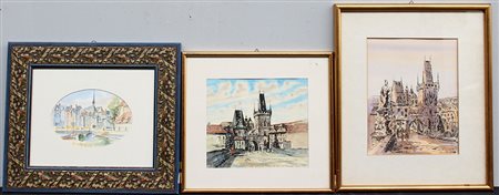 Lotto composto da due stampe ed un acquarello raffiguranti scorci di città,...