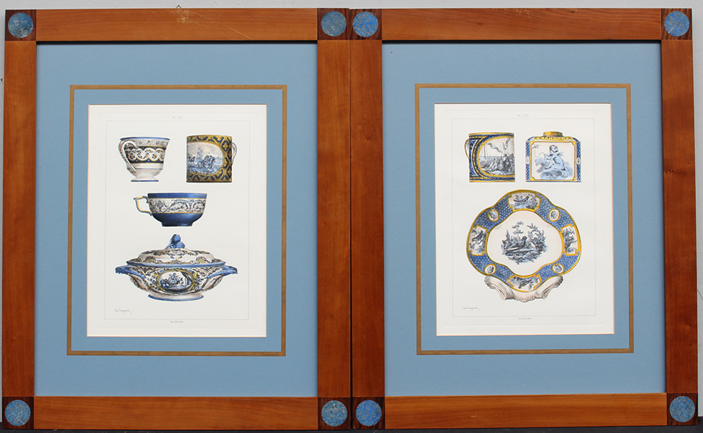 Coppia di stampe francesi (cm 50x40) raffiguranti decori di ceramiche, in cornice