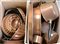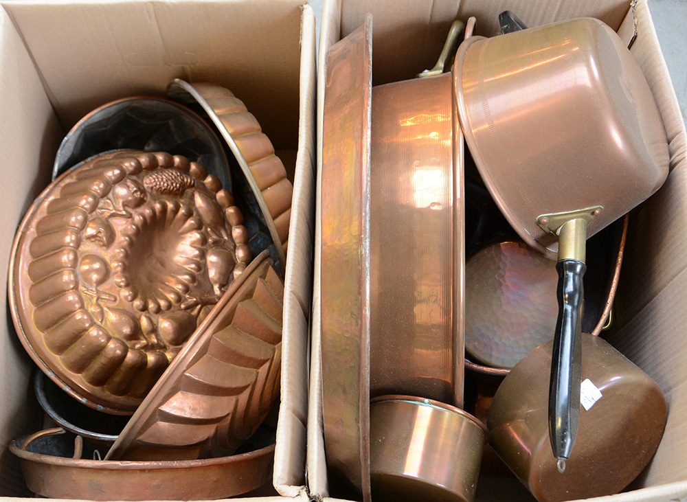 Lotto composto da numerose pentole e contenitori in rame. In due cartoni