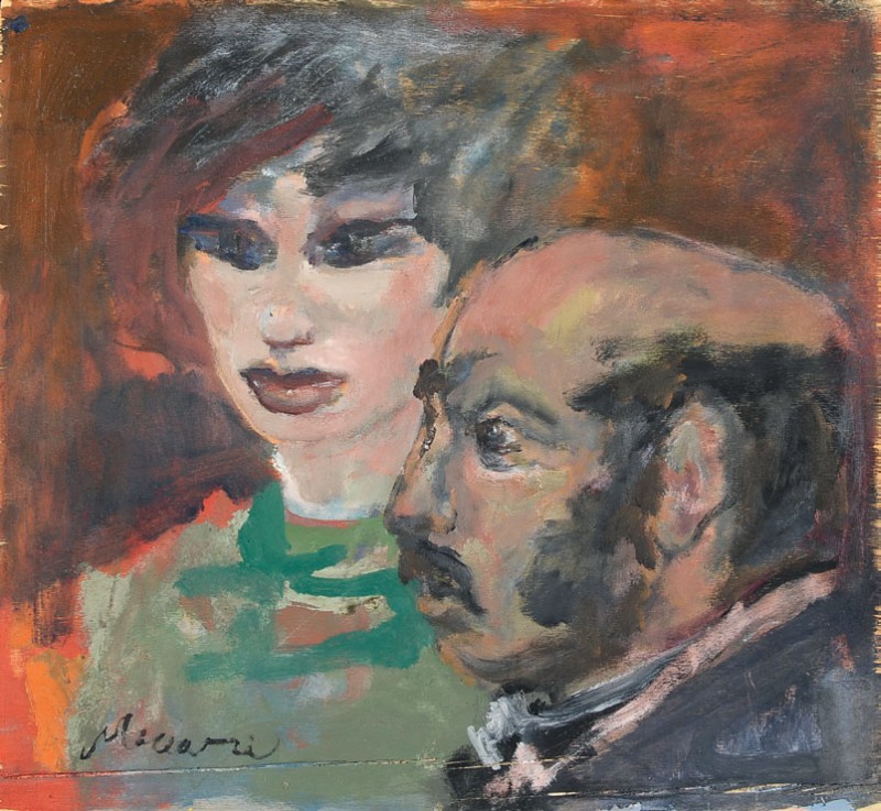 Mino Maccari Siena 1898 - Roma 1989 La coppia Olio su tavola, cm. 38,7x42,7...