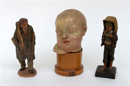 Manifatture diverse. Lotto composto da tre sculture in terracotta raffiguranti testa di fanciullo e figure popolari (difetti)