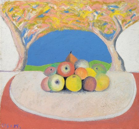 Giuseppe Cesetti Tuscania (Vt) 1902 - 1991 Natura morta Olio su tela, cm. 65x70 Firma in basso a sinistra: Cesetti. Al verso sulla tela: etichetta e due timbri Galleria "La Colonna", Firenze: etichetta e due timbri Galleria "D'Arte", Firenze.