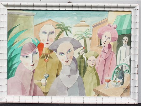 Firma indecifrata, "Figure in un paesaggio con case e palme" acquarello (cm 35x48) firmato in basso a destra, in cornice