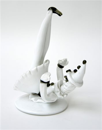 Scultura in vetro soffiato lattimo e nero ispirata alle figure dei "Tiepolo" di Fulvio Bianconi. Secolo XX. (h cm 22) (lievi difetti)