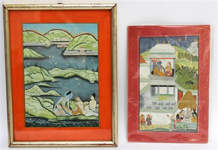 Due miniature indiane nei toni policromi raffiguranti scene di palazzo