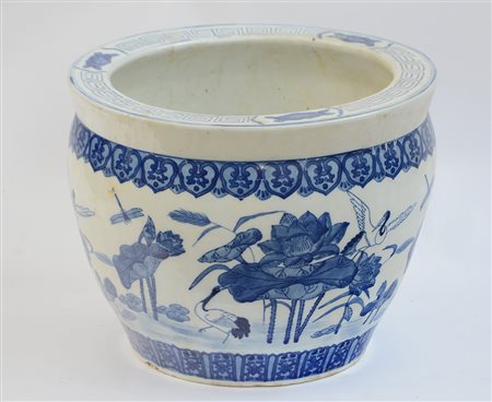 Giardiniere in porcellana bianca e blu decorata con uccelli e motivi floreali (h. cm 28,5x d. cm 36)