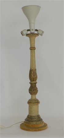 Candeliere in legno intagliato e laccato con base tonda, montato a luce elettrica (h cm 96) (difetti)