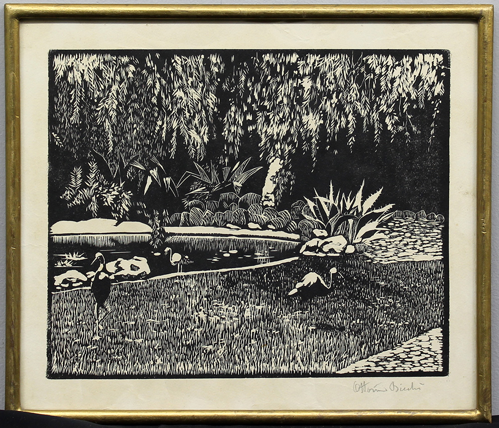 "Scorcio di giardino" xilografia (cm 30x35) firmato a matita in basso a destra, in cornice (lievi difetti)
