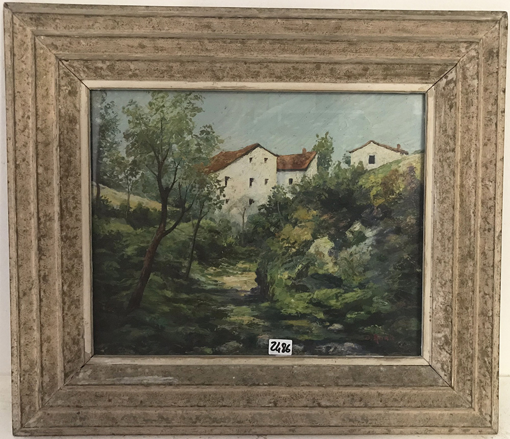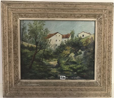 Orazio Abate ''Ruscello con edifici'' olio su tavola (cm 32x39) firmato in basso a destra, firmato e datato 1933 al verso. In cornice (lievi difetti)