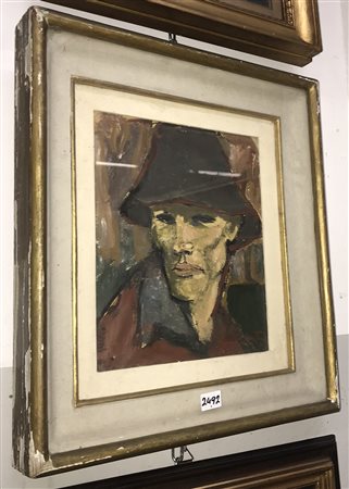"L'uomo della montagna" olio su tela applicata su cartone (cm 30x25) firmato e datato 1951 in basso a destra. Titolato, firmato, locato e datato al verso. In Cornice (lievi difetti)