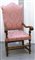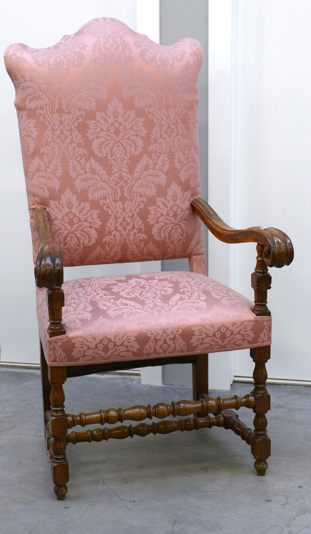 Poltrona con schienale sagomato, braccioli intagliati, gambe e traverse tornite a rocchetto. Rivestita in tessuto rosa a fiori (difetti)