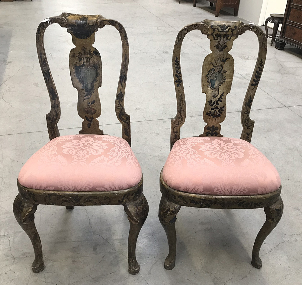 Coppia di sedie con schienale a giorno in legno dorato e decorato a motivi vegetali e stemma coronato (difetti)
