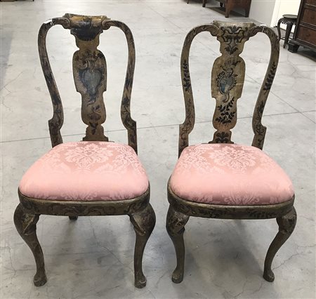 Coppia di sedie con schienale a giorno in legno dorato e decorato a motivi...