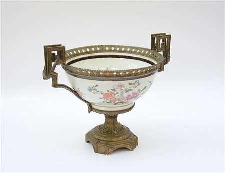 Ciotola in porcellana Famiglia Rosa con decoro floreale con montatura in bronzo dorato (h max cm 29)