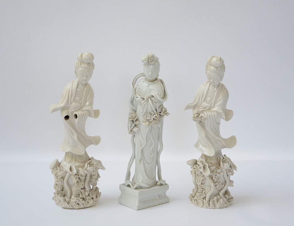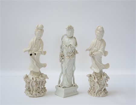 Tre Guanyin in porcellana blanc-de-Chine, Cina sec. XX (h max cm 29) (difetti, rotture e mancanze)
