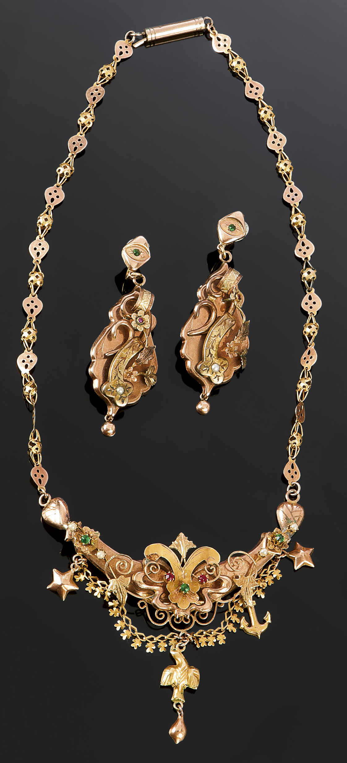 DEMI-PARURE Demi-parure composta da orecchini pendenti e collana in oro a basso titolo, seconda metà XIX secolo, con perline e pietre colorate Peso gr. 27,6