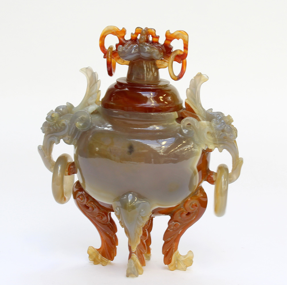 Incensiere tripode con coperchio in agata ed anse a motivi floreali (h cm...