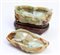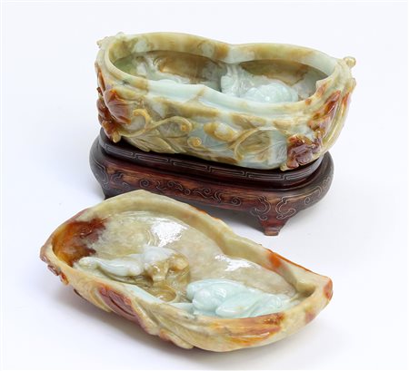 Scatola a forma di doppia zucca in giadeite scolpita con pipistrelli e carattere Shou e motivi benauguranti con base in legno (l. cm 15) (lievi difetti)