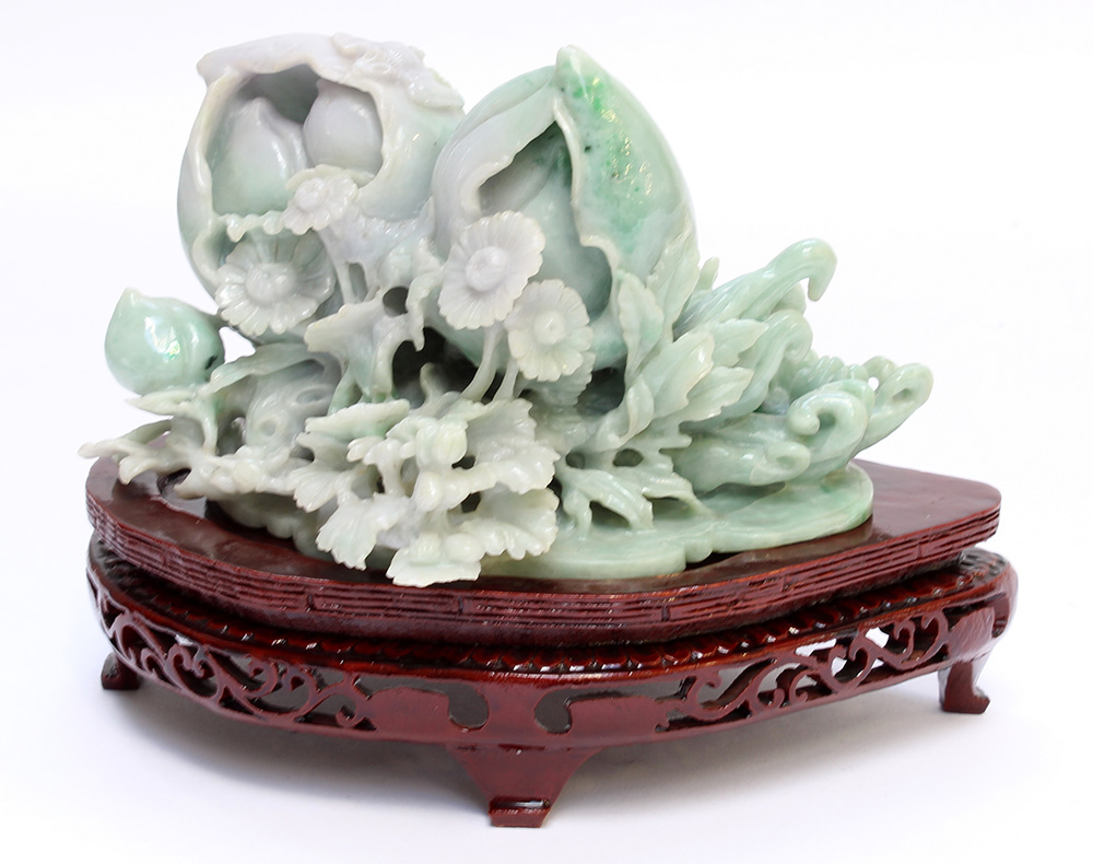 Gruppo in giadeite decorato con pesche e fiori, base in legno (l. cm. 19)