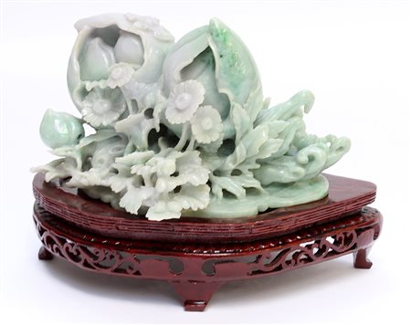 Gruppo in giadeite decorato con pesche e fiori, base in legno (l. cm....