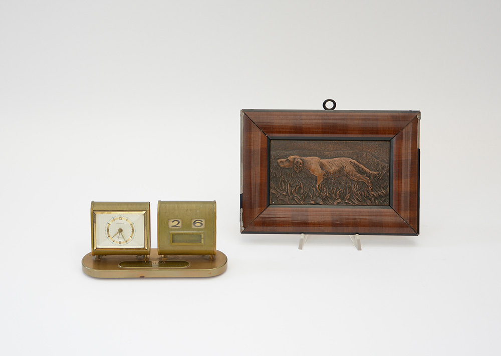 Lotto composto da un orologio e calendario da scrivania e una placchetta in bronzo raffigurante cane da caccia