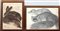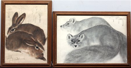 Lotto di due disegni su carta raffiguranti lontre e conigli, firmati con iscrizioni (cm 34x50 e cm 41x30) in cornici (difetti)