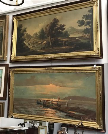 Coppia di dipinti ad olio raffiguranti una marina firmata Remo Testa e un paesaggio lacustre (cm 60x120) in cornici (difetti)