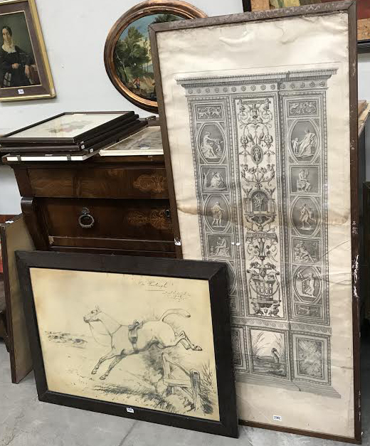 Lotto composto da una litografia raffigurante cavallo e una stampa a soggetto di raffaellesche, in cornici (gravi difetti)