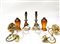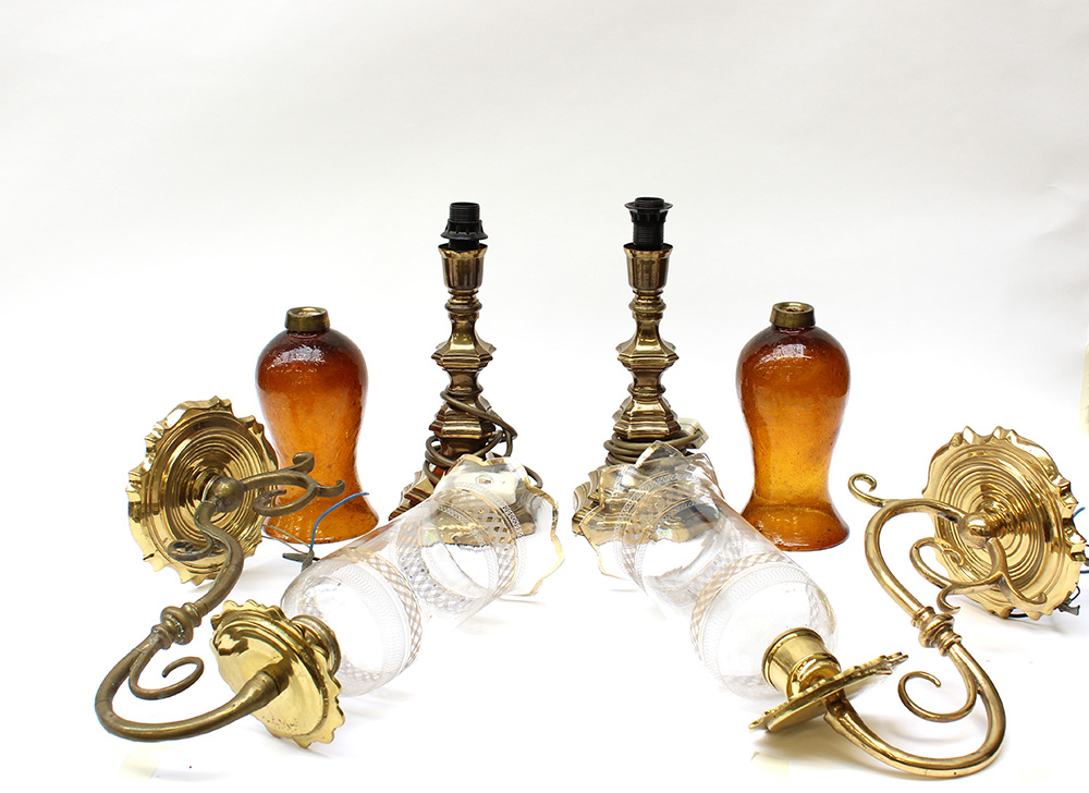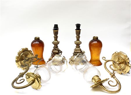 Lotto composto da una coppia di applique in ottone con paralumi in vetro e una coppia di lampade da tavolo unite a due paralumi in vetro color ambra (difetti)