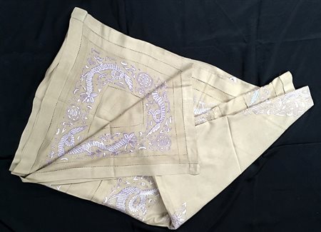 Copriletto in seta ecrù ricamato in seta nei colori bianco e lilla con motivi a draghi e ideogrammi (cm 270x240) (lievi difetti)