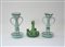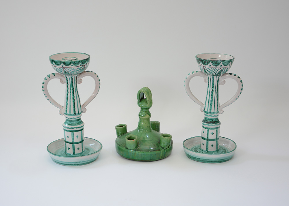 Manifatture dell'Italia centro meridionale, lotto di ceramiche composto da una coppia di candelabri biansati e una lucerna a quattro fiamme smaltata verde (difetti)