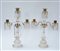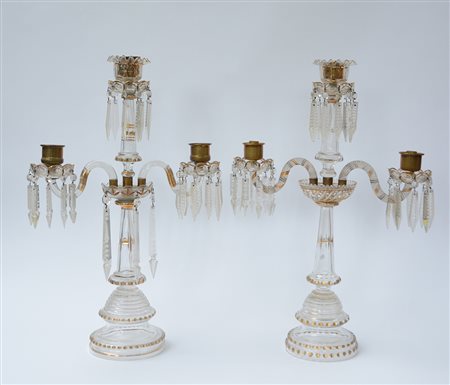 Coppia di candelieri a tre fiamme in vetro e cristallo. Basi circolari e...