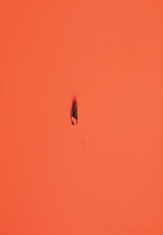 Bernard Aubertin Fontenay-aux-Roses 1934 Semema, 1990 Bruciatura su carta rossa, cm. 100x70 Firma e data in basso a destra: Bernard Aubertin 1990, titolo in basso a sinistra: Semema. Al verso: timbro Dumus Jani / Illasi. Foto autenticata dall'artista in data 18-09-2008.