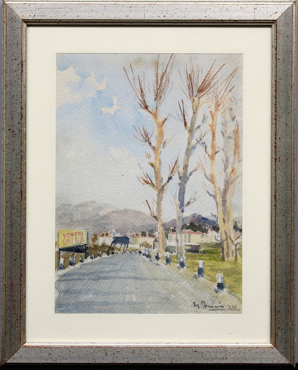 "Strada con alberi" acquerello su carta (cm 26x25,5) Firmato e datato XVI (1938) In basso a destra. In cornice