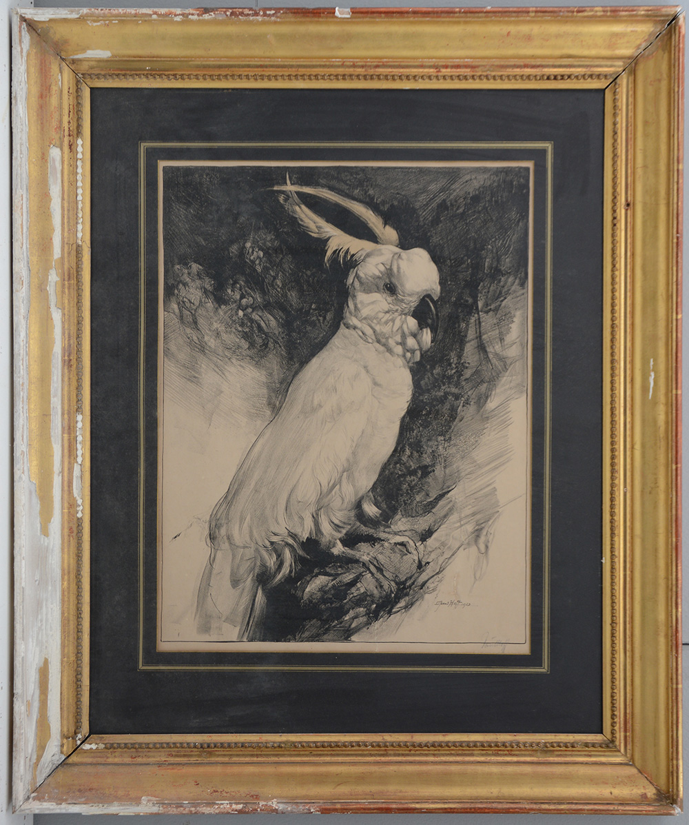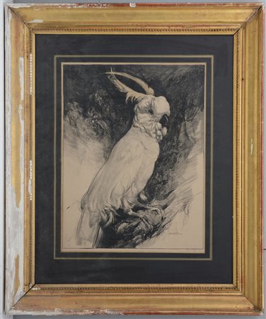Litografia raffigurante pappagallo controfirmata in basso a destra, in...