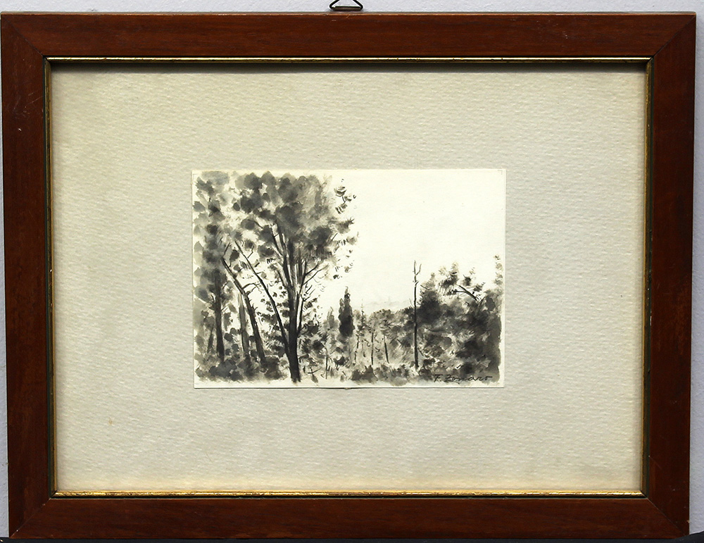 Ignoto "Alberi" penna e inchiostro su carta (cm 12x17) Firmato in basso a destra, dedicato al retro. In cornice