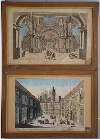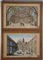 Coppia di antiche stampe a colori raffiguranti architetture con figure in...