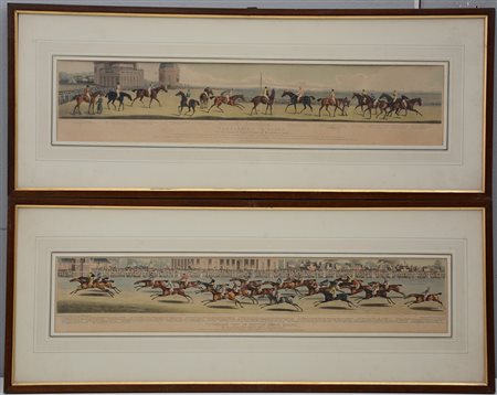 Coppia di litografie inglesi a colori raffiguranti corse di cavalli, in cornice