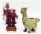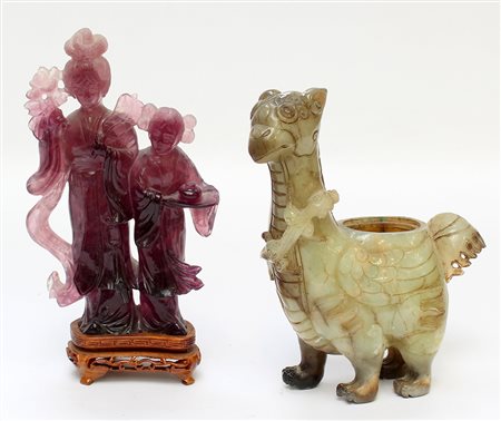 Lotto composto da una scultura in quarzo viola raffigurante una dama dalle lunghe vesti e una scultura in pietra dura raffigurante una creatura fantsatica, una base in legno (difetti)