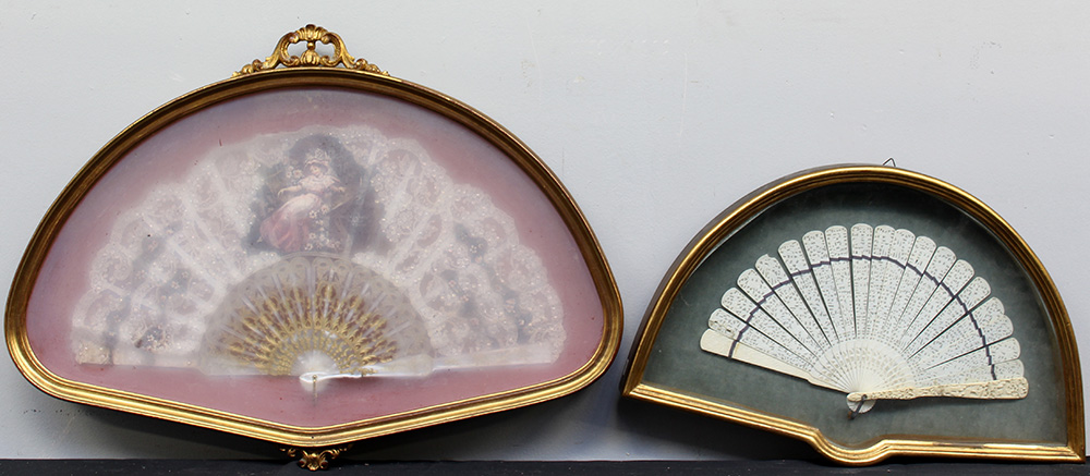 Lotto composto da due ventagli, uno con stecche intagliate in avorio e uno con pagina dipinta a figura femminile, in teche (difetti)