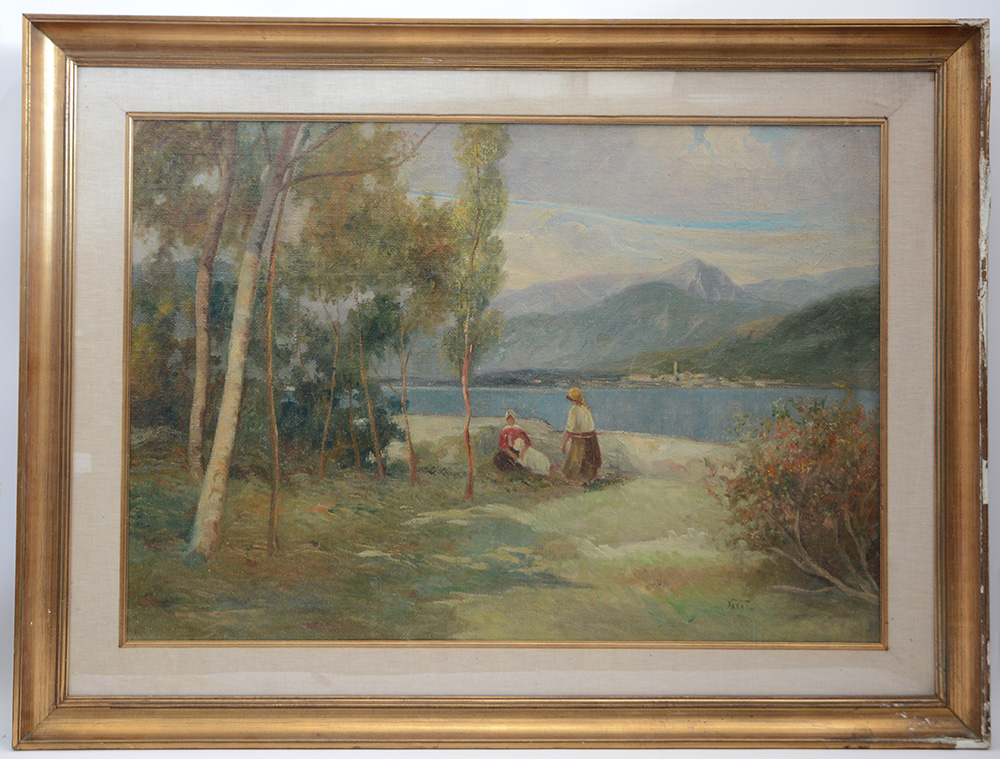 Varli "Paesaggio lacustre con contadine" olio su tela (cm 70x100) firmato in...