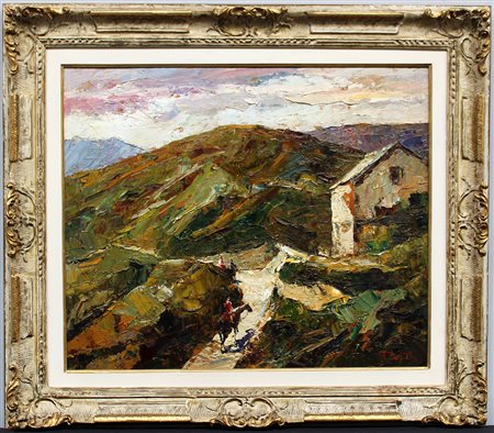 Ignoto secolo XIX "Paesaggio montano" olio su compensato (cm 50x60) Firmato in basso a destra, inscritto e datato 1941 al retro. In cornice
