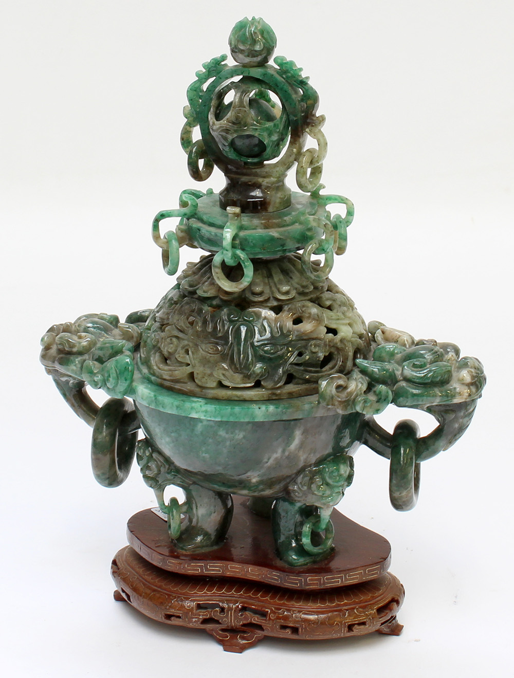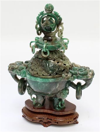 Incensiere tripode in pietra dura con coperchio traforato, base in legno (h cm 26) (lievi difetti)