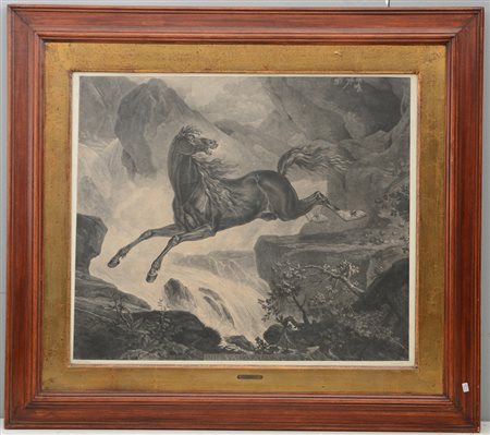 Litografia francese raffigurante cavallo in un paesaggio, in cornice