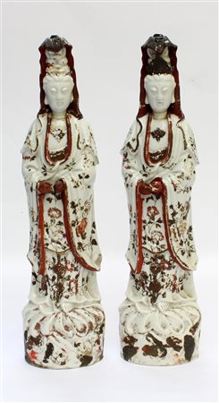Coppia di Guaniyn in porcellana policroma su fondo bianco (h cm 48) (difetti)